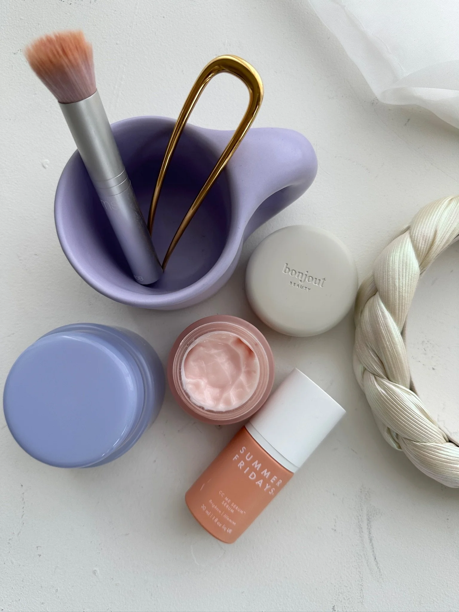 I grab a clean, damp beauty blender or brush and dab the product gently into my skin.